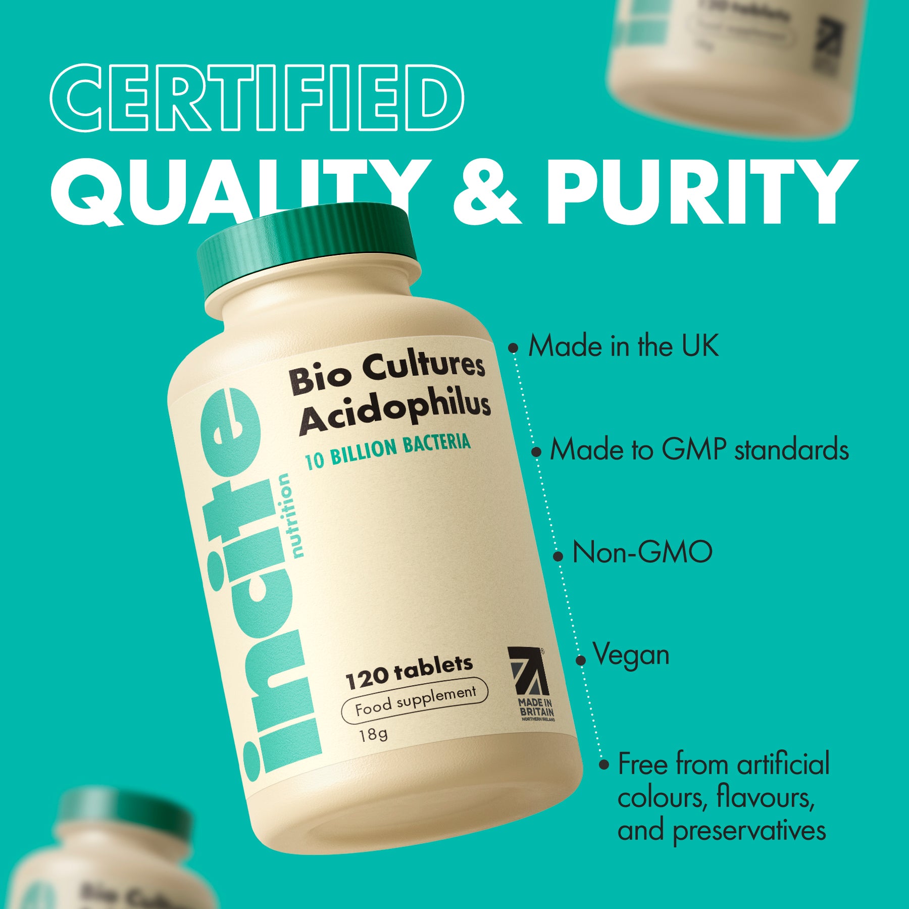 - UK MADE to GMP STANDARDS: our Acidophilus Bio Cultures Vegan Capsules are made and manufactured in the UK with PREMIUM INGREDIENTS to the highest of standards. They are its suitable for vegan and vegetarian. Incite Nutrition Bio Cultures Complex Vegan Capsules