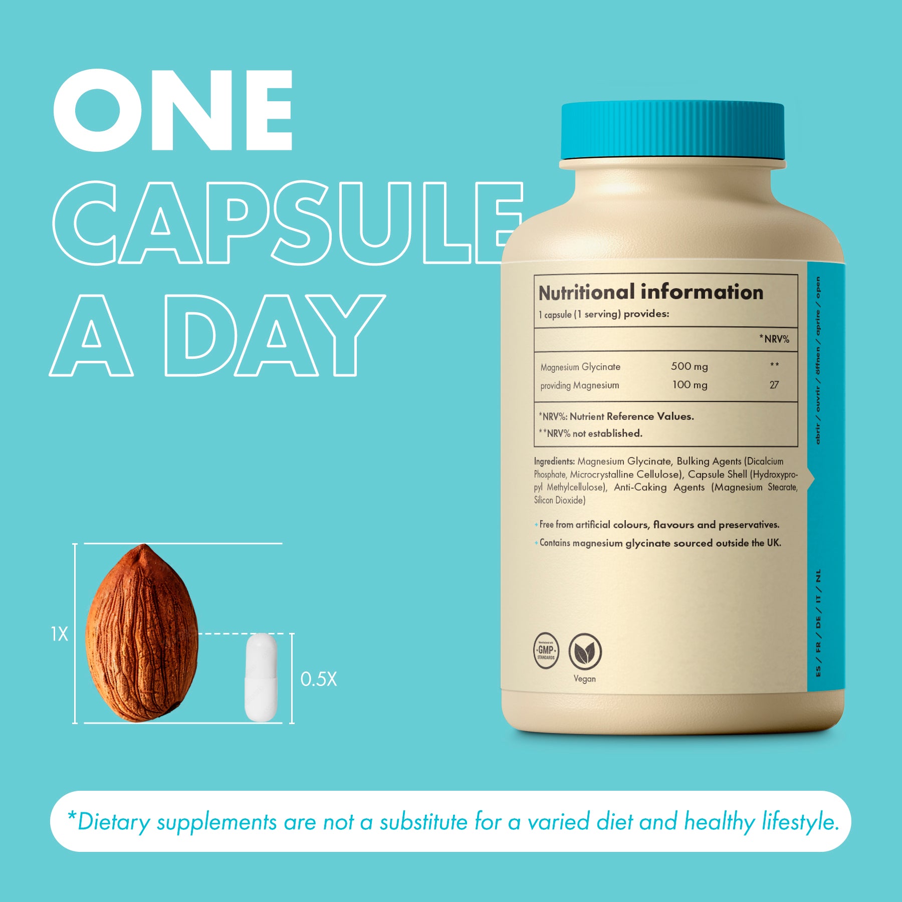 Premium Magnesium Glycinate 500mg, 3-month supply and vegan-friendly. Supports energy, mental health & nervous system. Made in the UK to GMP standards.