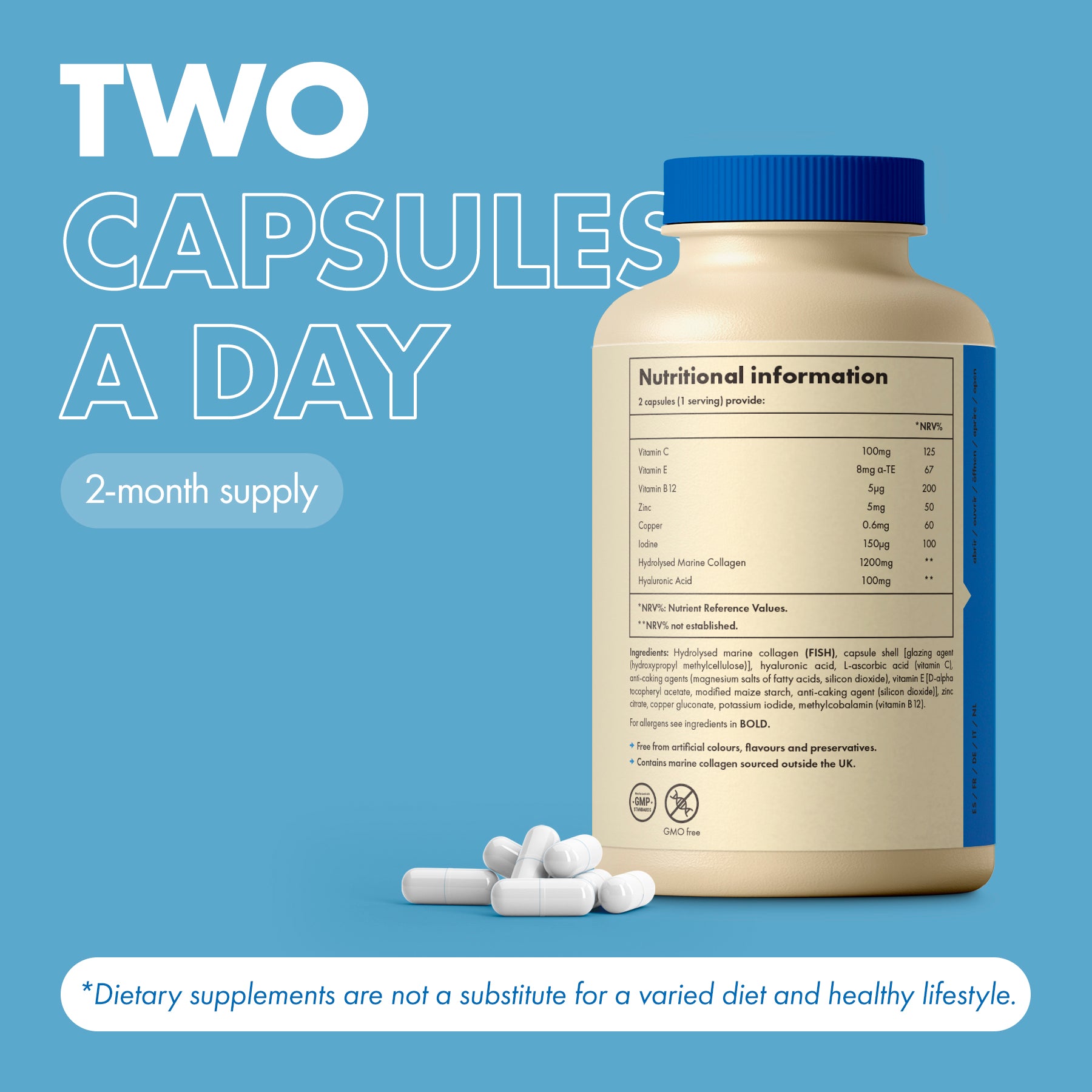 Take 2 capsules daily for a 1200mg of Marine Collagen intake,