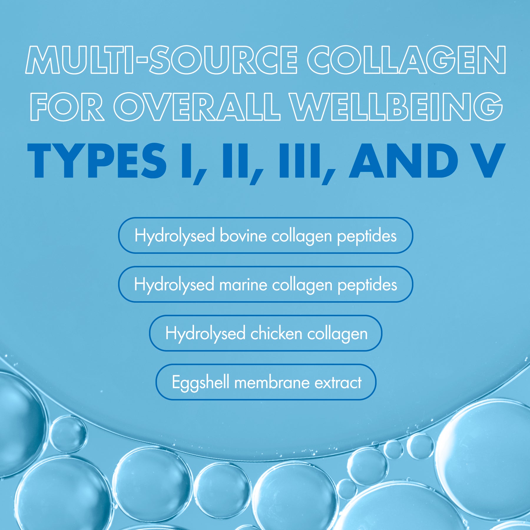 - Multi-collagen source: Our collagen powder provides a reliable intake of collagen I, II, III, and V, sourced from bovine collagen peptides, chicken collagen, marine collagen peptides, and eggshell membrane extract.